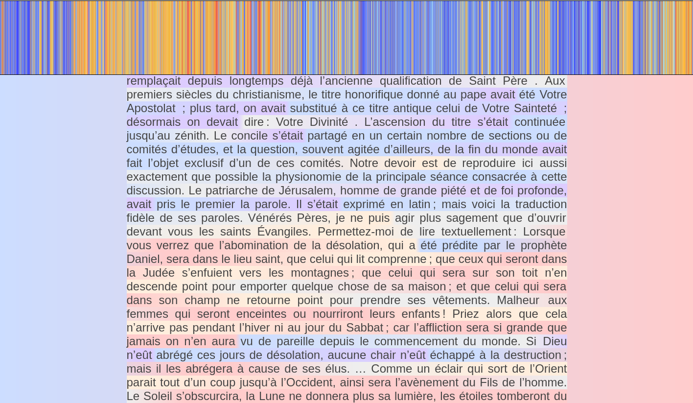 Cette édition est issue d’une réflexion sur les dispositifs de lecture « tabulaire »: table des matières, index, sommaire, etc. Ici, on se déplace dans le texte à l’aide d’un bandeau montrant l’usage des temps verbaux dans texte : en rouge le futur (i.e. la « fin du monde » dont il est question – l’explosion du soleil) et en bleu le passé.