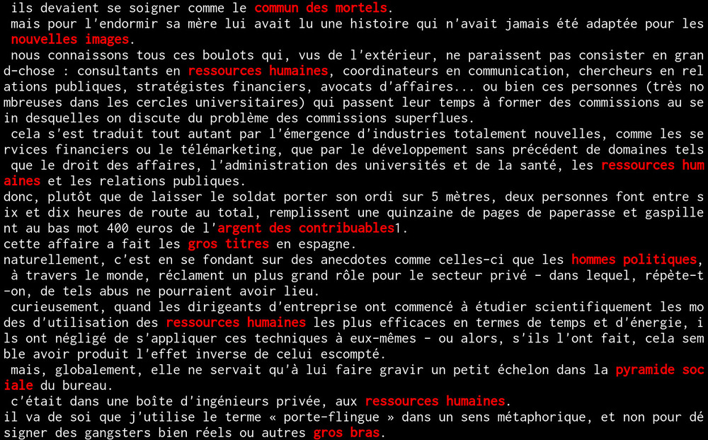 bgrep est un ajout à cet arsenal analytique. Mais contrairement à grep, fgrep, etc., bgrep ne permet pas de déterminer soi-même les motifs à rechercher: il cherche les « bruits » compilés par Jacques Henri Michot (et son avatar Barnabé B) dans Un ABC de la barbarie1, ces « stéréotypes “médiatiques” – paroles gelées, poisons pour la pensée » comme « charges sociales », « forces de l’ordre », « ressources humaines » ou « commun des mortels ».