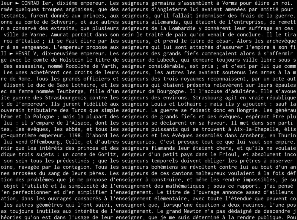 Ce texte, on ne le voit jamais directement, mais on le perçoit comme un écho qui prend forme par l’agglomération des énoncés non-identifiées issus des dizaines de milliers de textes de la bibliothèque Wikisource. Goody, Jack, La Raison graphique. La Domestication de la pensée sauvage, trad. Jean Bazin et Alban Bensa, Paris, Les Éditions de Minuit, 2002.↩︎ Winter, Thomas Nelson, « Roberto Busa, S.J., and the Invention of the Machine-Generated Concordance », Faculty Publications, Classics and Religious Studies Department, n° 70, 1999.↩︎Notes