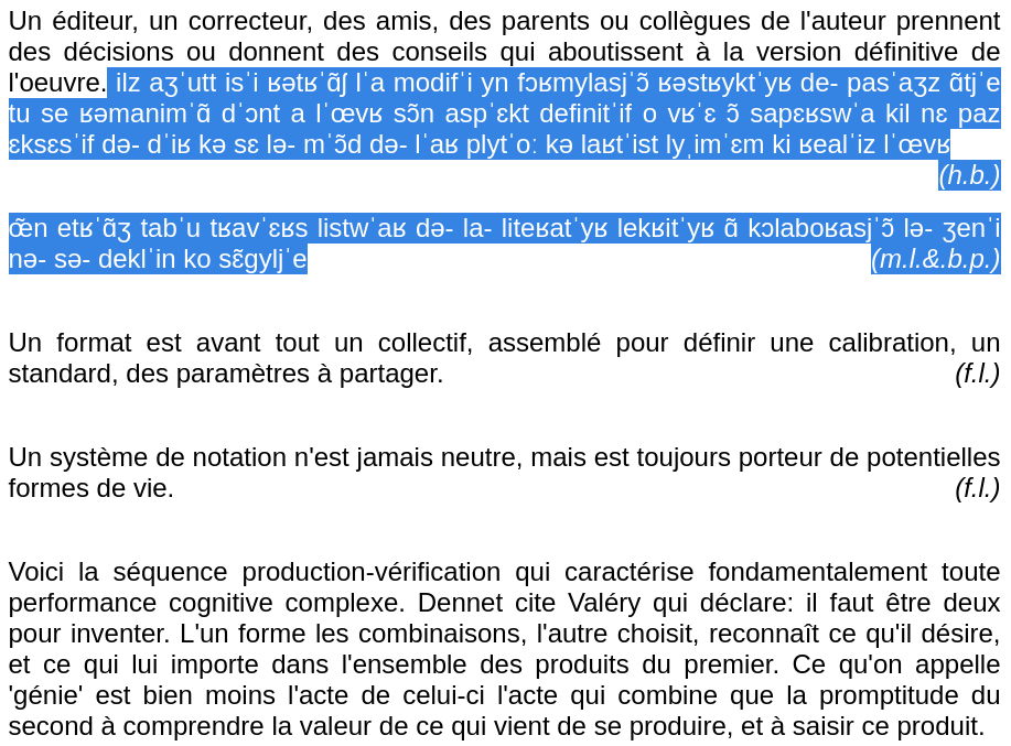 Mais si l’on se décide à sélectionner l’une ou l’autre de ces citations pour la copier-coller ailleurs (dans un article, un post sur les réseaux sociaux, un fichier de citations inspirantes), le texte se transforme: à la place des mots sélectionnés on voit alors leur représentation phonétique (IPA1), invitant les copie-colleureuses à intérioriser par (sub)vocalisation les textes, à les intégrer à leur vie et à les mettre en pratique.