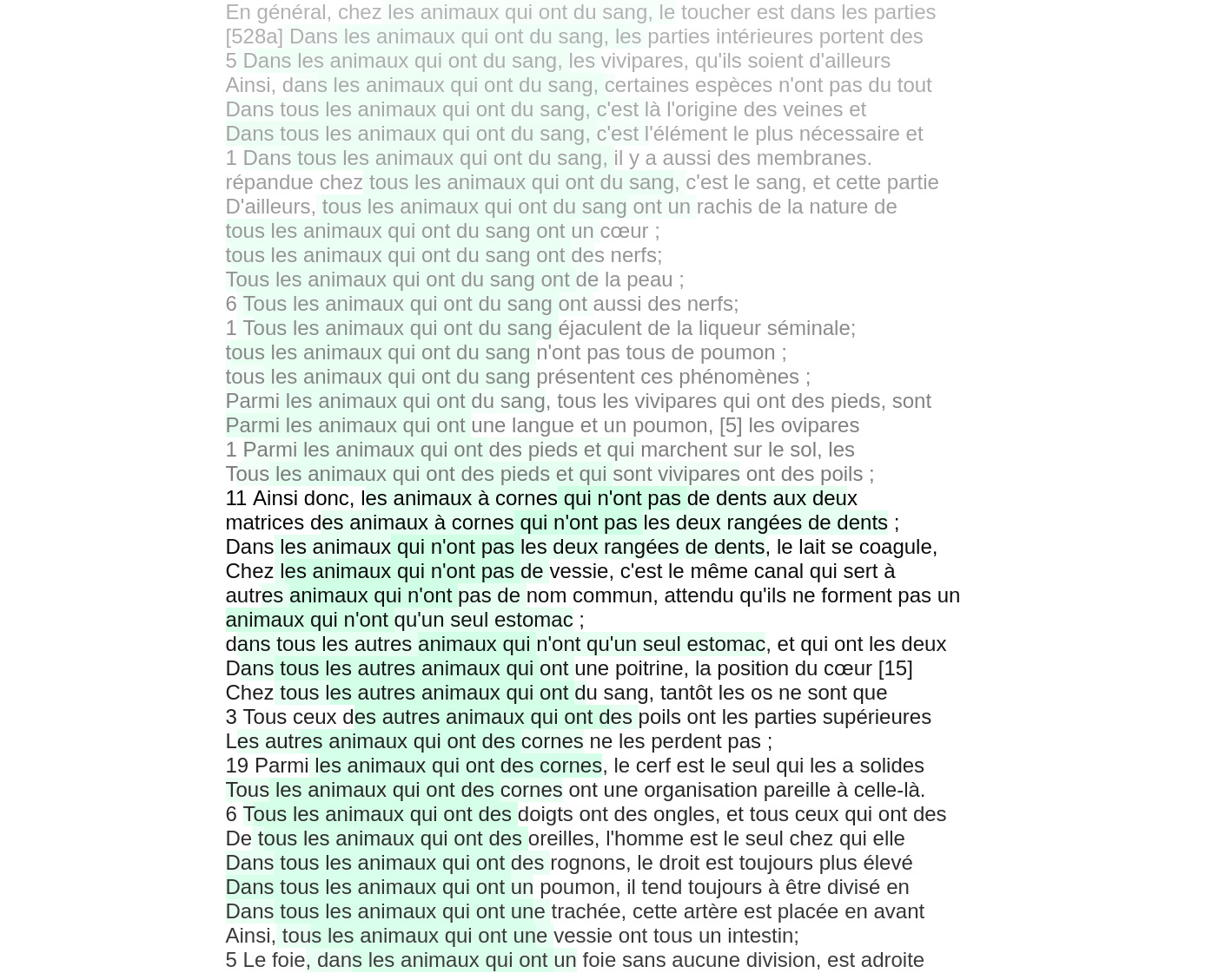 J’ai réorganisé, phrase par phrase, les textes qu’Aristote consacre aux animaux1, en utilisant une technique de comparaison de textes, la plus longue sous-chaîne commune (longest common substring), souvent employée pour la reconnaissance automatique du plagiat, qui remplit ici une fonction heuristique, détermine un parcours de relecture fondé sur des régularités conceptuelles et stylistiques.